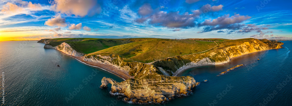 Aerial view of Durdle Door, a natural limestone arch on the Jurassic Coast near Lulworth in Dorset, England