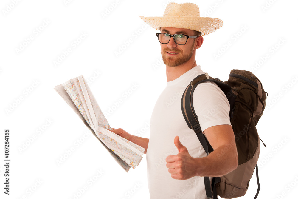 Traveler with straw hat, white shirt, backpack and map seems lik