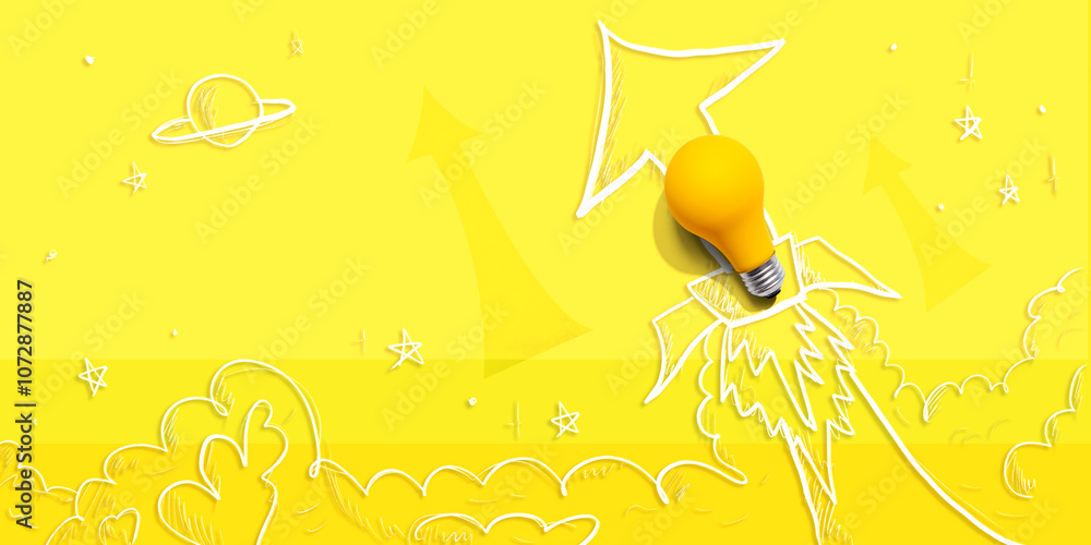Idea light bulb flying to the sky like a rocket with arrows - Flat lay