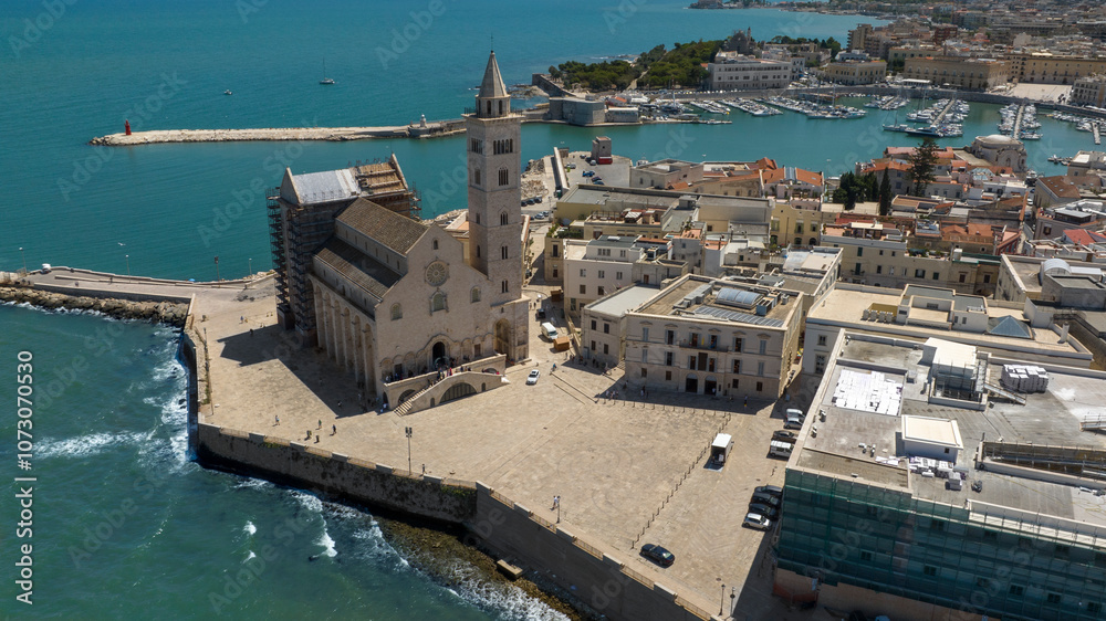 Aerial view of the Duomo of Trani, in Puglia, Italy. The cathedral basilica of Santa Maria Assunta, commonly known as San Nicola Pellegrino, is the main place of Catholic worship in the city.