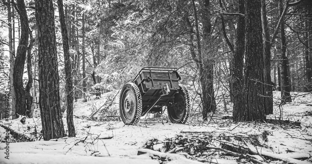 Abandoned German Infantry Cart Or Handcart Infanteriekarren If8 Of World War Ww Ii On Forest Ground. German Military Ammunition. Armed Forces Of Germany Of World War Ii. Vintage Handcart German Army