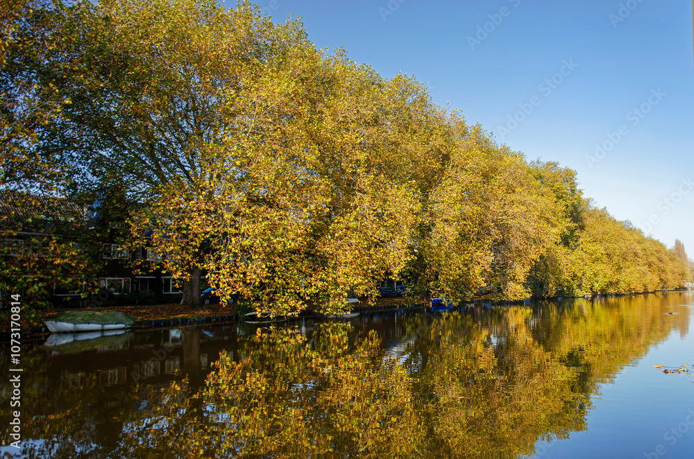 Gouda, The Netherlands, November 3, 2024: a row of plane trees between Breevaart canal and the adjacent residential neighbourhood reflect in the motionless water of the canal