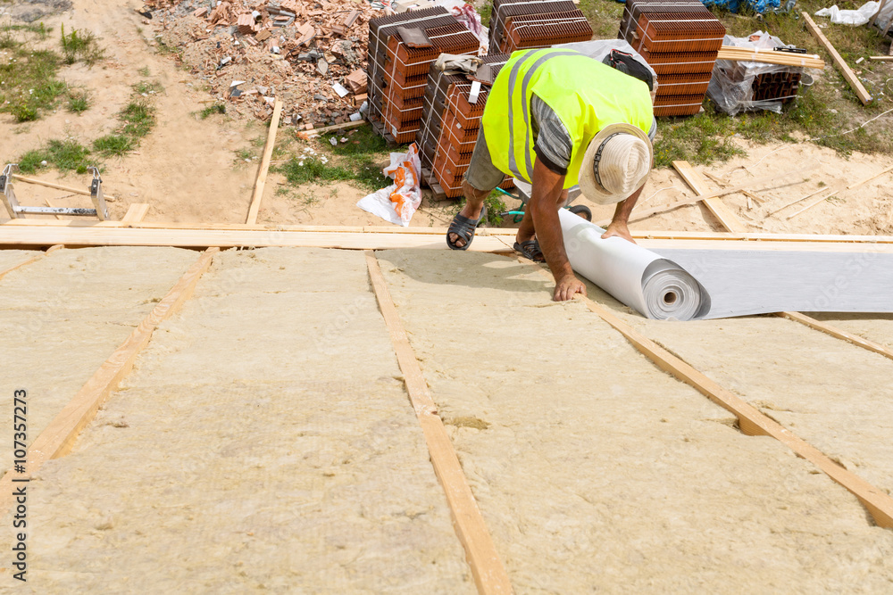 Roof insulation. Worker laying roofing membrane over insulation layer (rockwool)