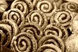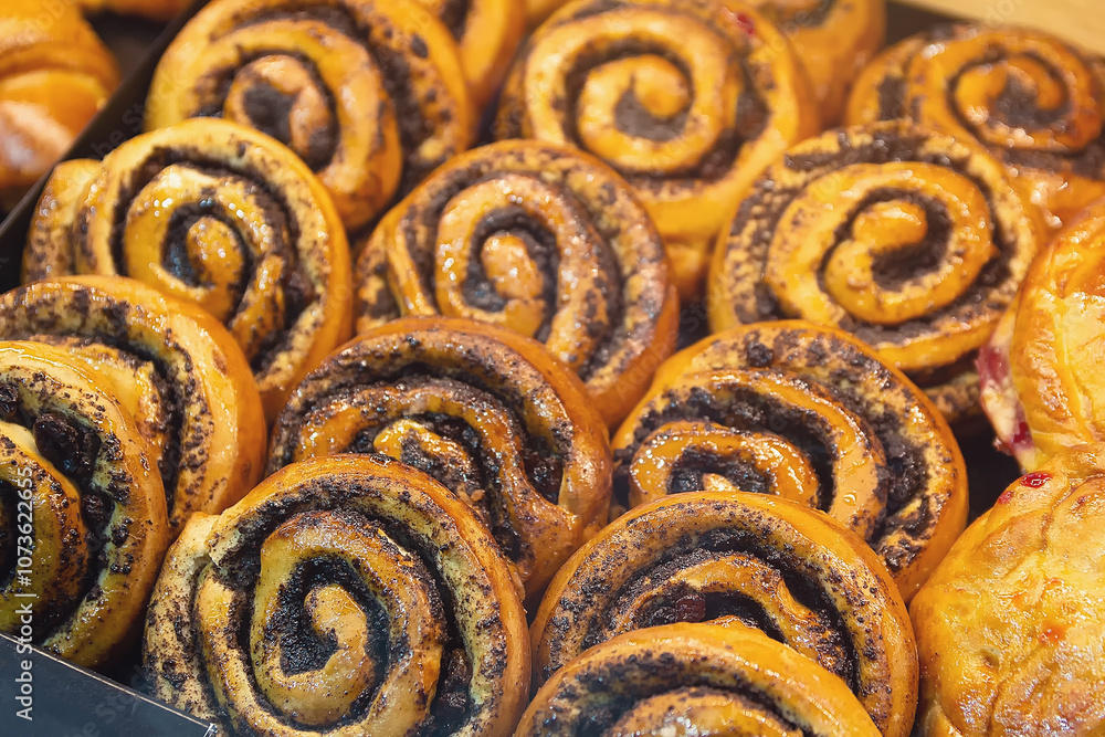 Fresh delicious buns with poppy seeds on the bakery counter