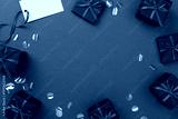 Mock up space with black gift boxes on color background, top view.Black Friday concept
