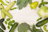Different fresh green vegetables on wooden background, top view