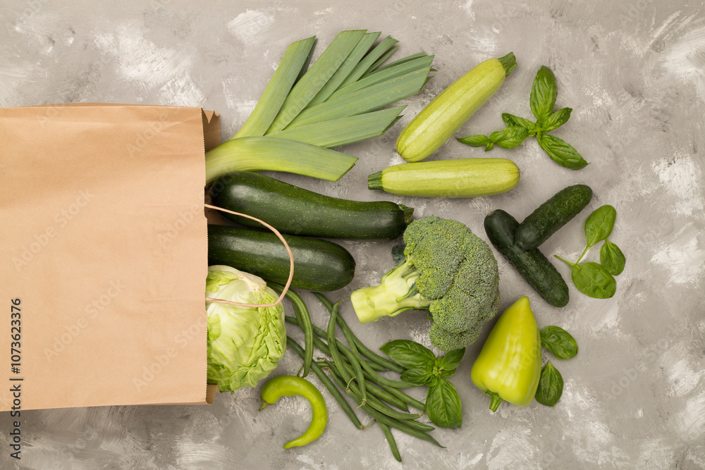 Paper bag with different fresh green vegetables on wooden background, top view