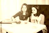 Two beautiful women drinking tea.