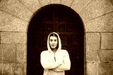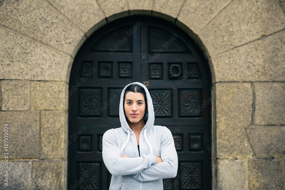 Confident successful strong fitness woman. Urban female athlete portrait outside in the street.