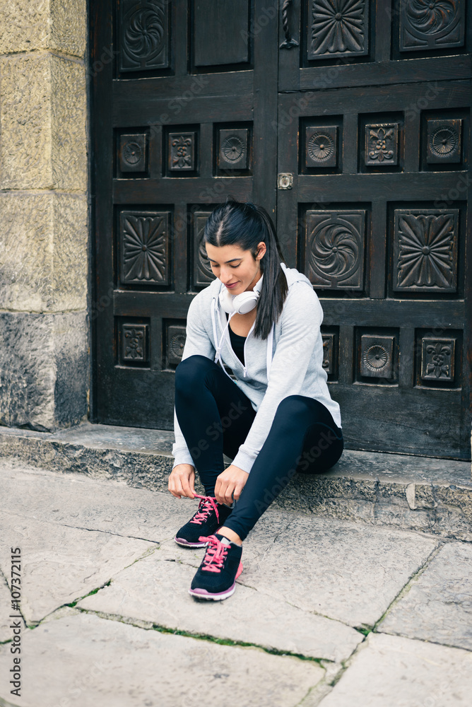 Urban fitness young woman taking a workout rest for lacing running footwear.