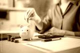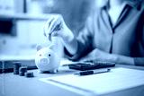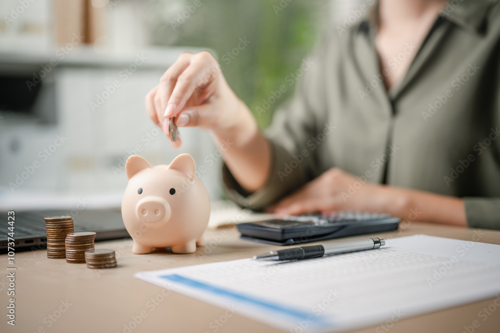 financial, loan, finance, wealth, investment, piggy bank, insurance, invest, investor, planning. A woman is putting coins into a piggy bank. Concept of saving money and being financially responsible.