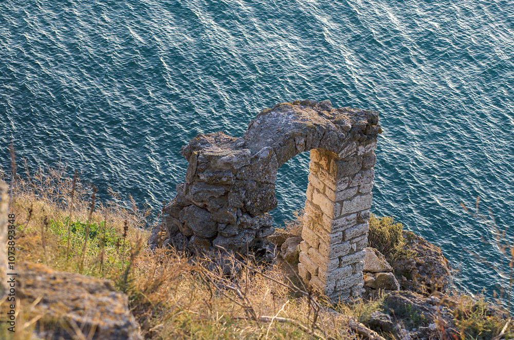 Roman arched gate, part of a fortress on a rocky seashore. Cape Kaliakra, Bulgaria