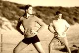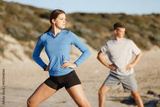 Young couple on beach training together