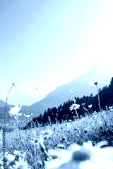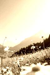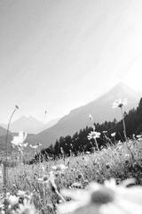 Vibrant wildflowers, including delicate daisies, bloom across a sunlit alpine meadow, set against a backdrop of majestic mountains and a clear blue sky. the scene exudes tranquility and natural beauty
