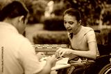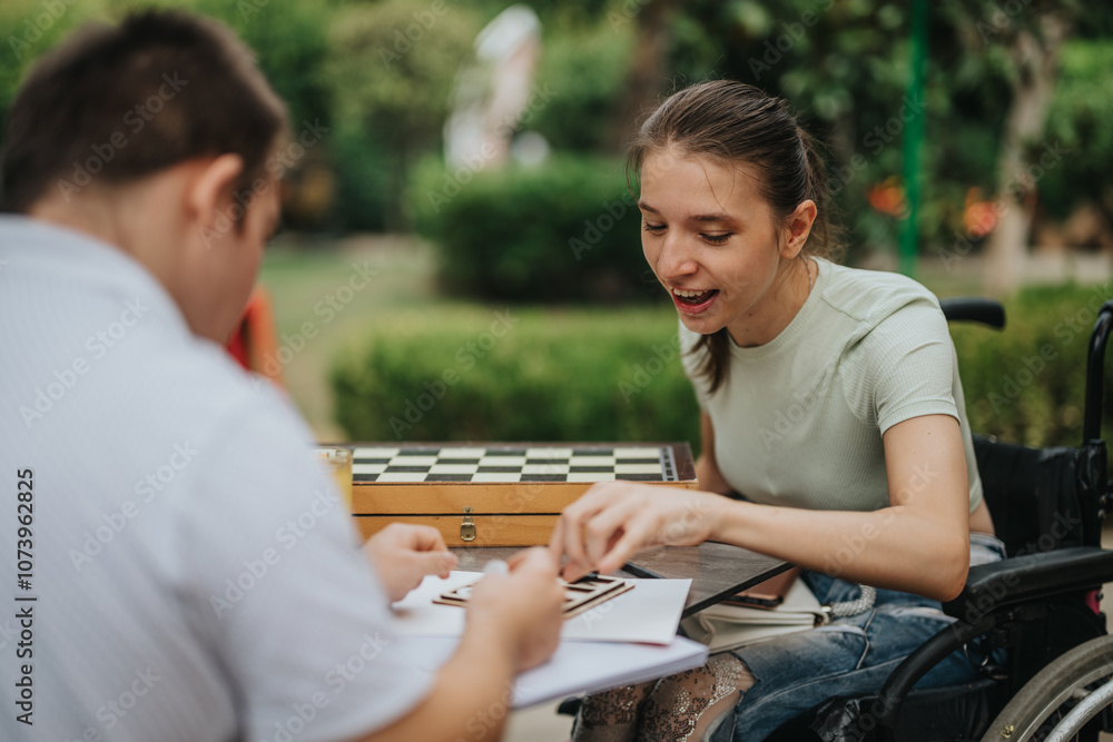 A young woman in a wheelchair enjoys a game of chess with a friend in a park, highlighting friendship and inclusivity.