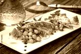 Fish fillet with chickpeas, carrot puree and vegetables