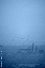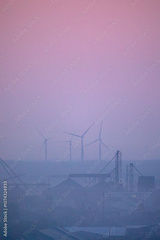 The Beautiful Wind Turbines Gracefully Silhouetted Against a Serene and Misty Sunset Sky