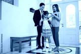 Family Asian mother helping her primary daughter put bag backpack and get dressed in front of home before go to school, with the father dressed in a suit standing and waiting to be dropped off