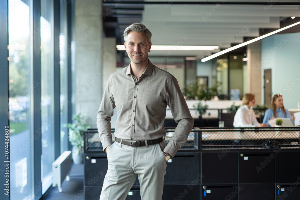 Handsome friendly successful businessman looking camera with hands in pockets standing at modern office indoors with people of the background.