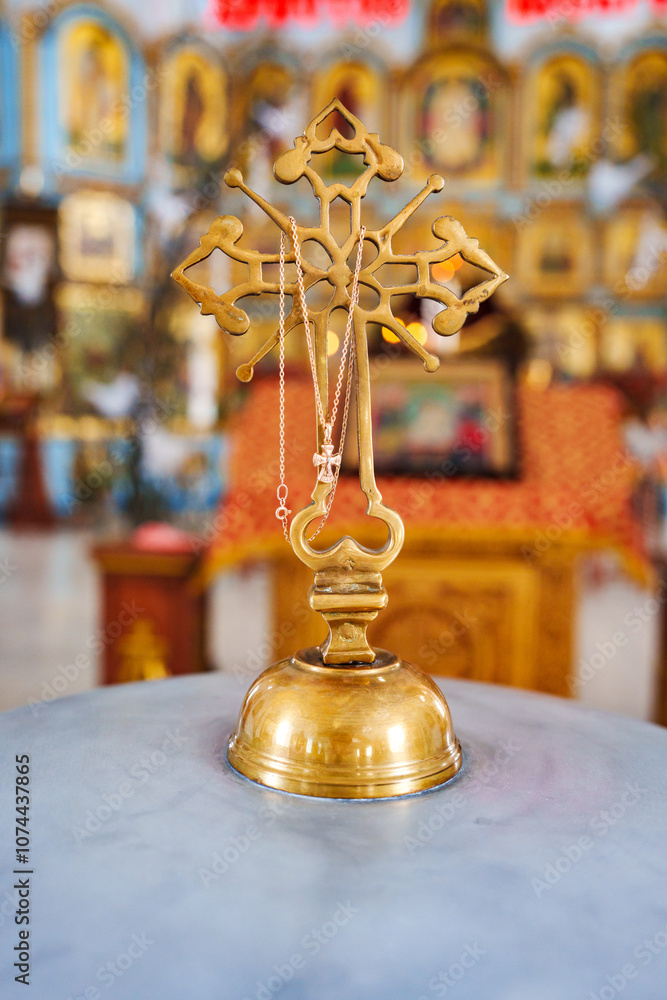 Baptismal crosses hang on the large cross of the baptismal font lid in church.