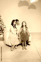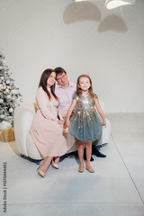 Mom and dad admiring their daughter in a beautiful shiny dress.