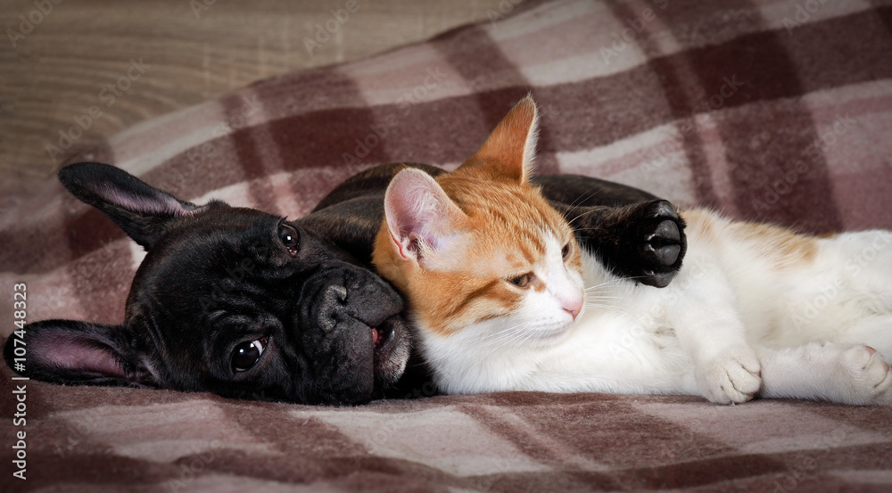 White cat and black dog sleeping together under a knitted blanket. Friendship cats and dogs, animals in the apartment house. Cute pets. Love the different species of animals