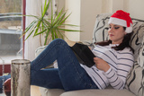 Beautiful woman reading a book while relaxing on the sofa in the apartment at Christmas