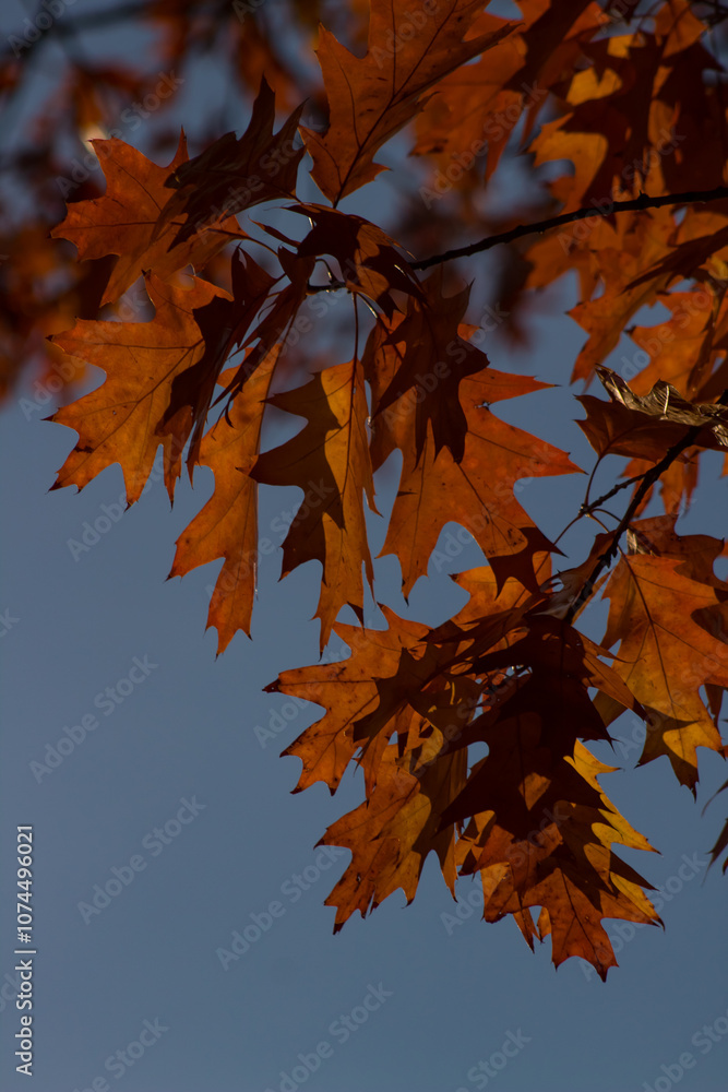 11.11.2024 Białystok Polska. Jesienne liście dębu na tle nieba.