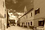 Patio with colorful houses and church on the famous island Burano, Venice, Italy