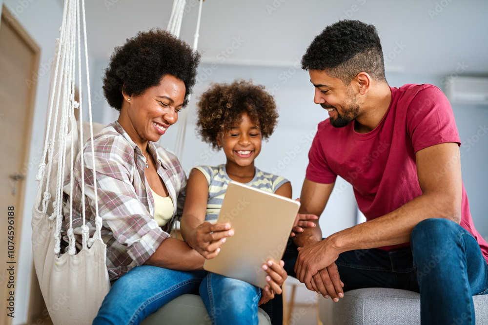 Smiling african american family working with a computer at home. Technology people concept