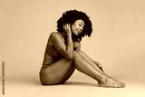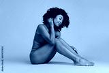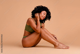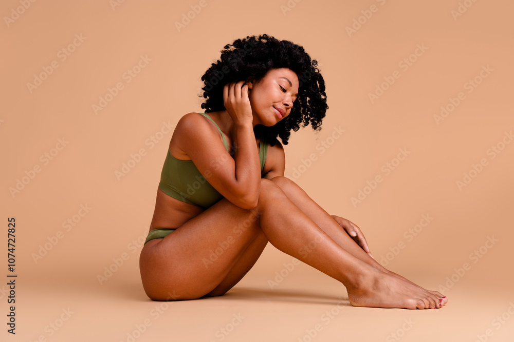 No filter studio photo of dreamy pretty woman underwear accepting imperfect skin empty space isolated beige color background