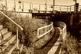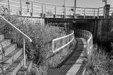 Curving steel footbridge under a bridge for motorized traffic in Gouda, The Netherlands