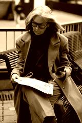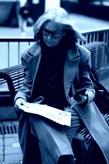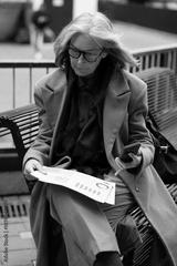Middle-aged businesswoman reviewing documents on a city bench during a calm afternoon