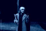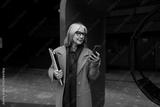 An older woman in glasses checks her smartphone while holding a folder, standing near modern architecture in a city setting