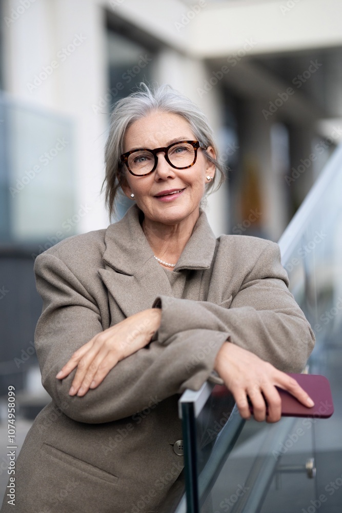 Elderly businesswoman confidently poses outside her office during a sunny afternoon, showcasing her professional style and experience