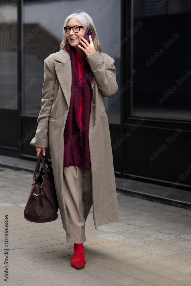 Senior businesswoman walking confidently outside on a city street, engaging in a phone conversation while dressed in stylish winter attire