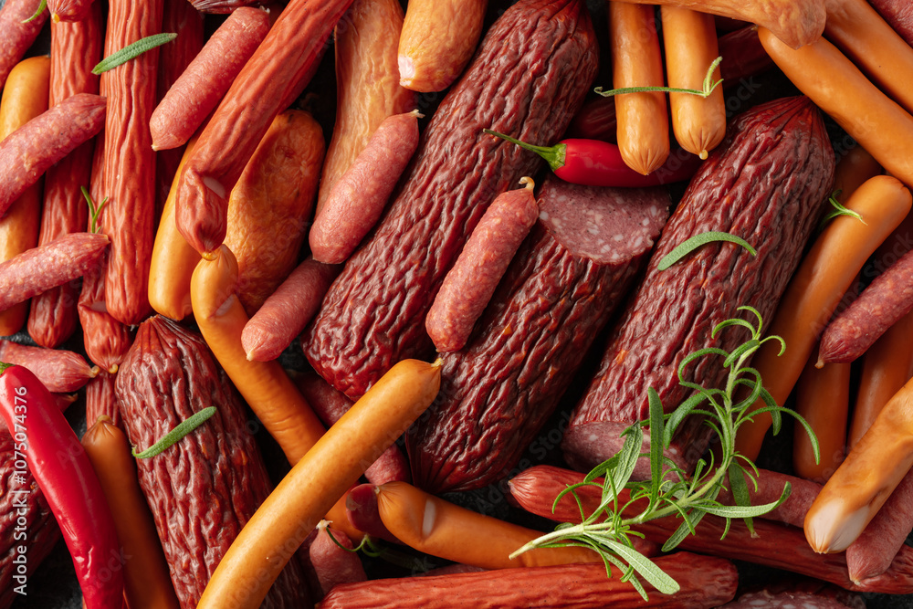 Various dry-cured and smoked sausages with red peppers and rosemary.