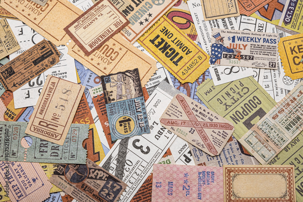 A bunch of vintage tickets from around the world, theater, movie, concerts, transport, hotel reception cards and other documents