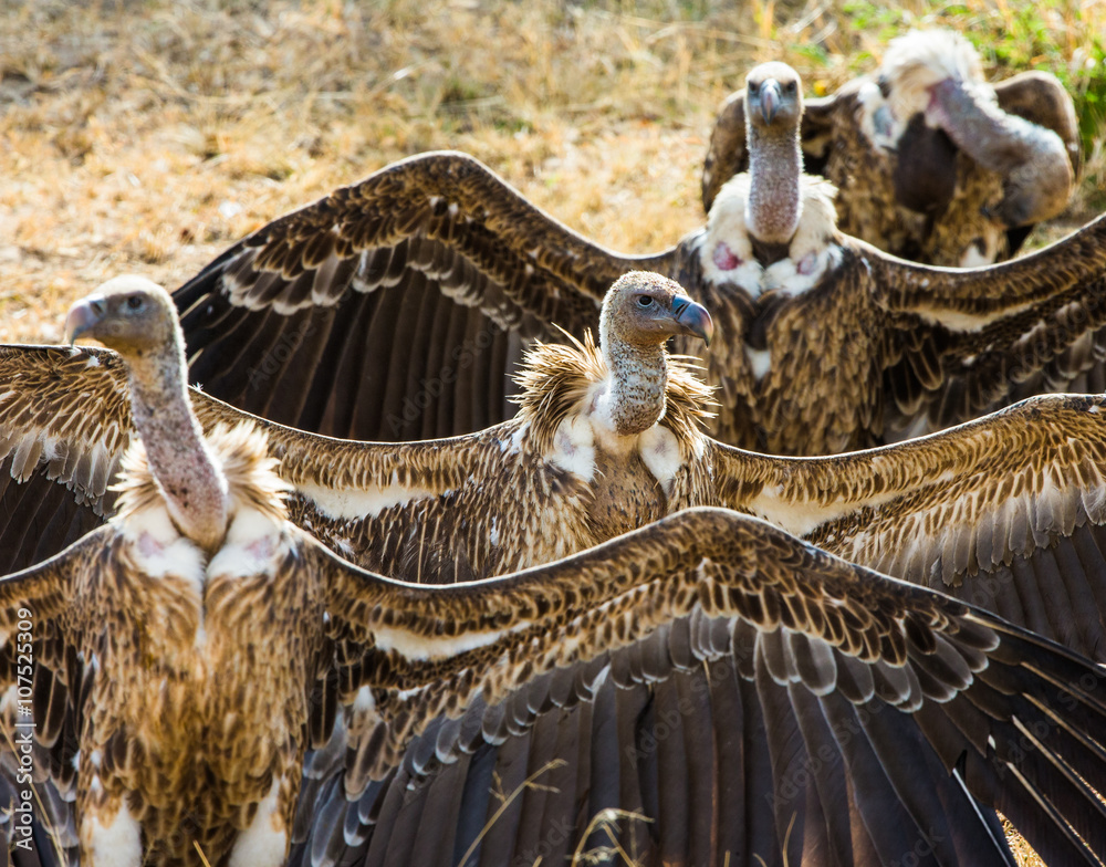 Predator birds are sitting on the ground. Kenya. Tanzania. Safari. East Africa. An excellent illustration.