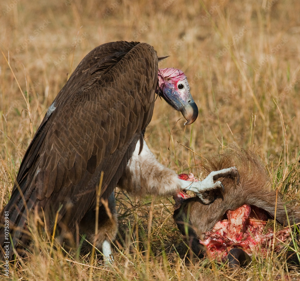 Predatory bird is eating the prey in the savannah. Kenya. Tanzania. Safari. East Africa. An excellent illustration.