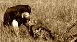 Predatory bird is eating the prey in the savannah. Kenya. Tanzania. Safari. East Africa. An excellent illustration.