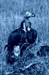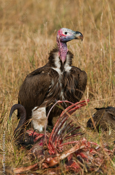 Predatory bird is eating the prey in the savannah. Kenya. Tanzania. Safari. East Africa. An excellent illustration.