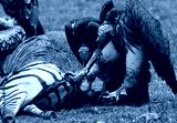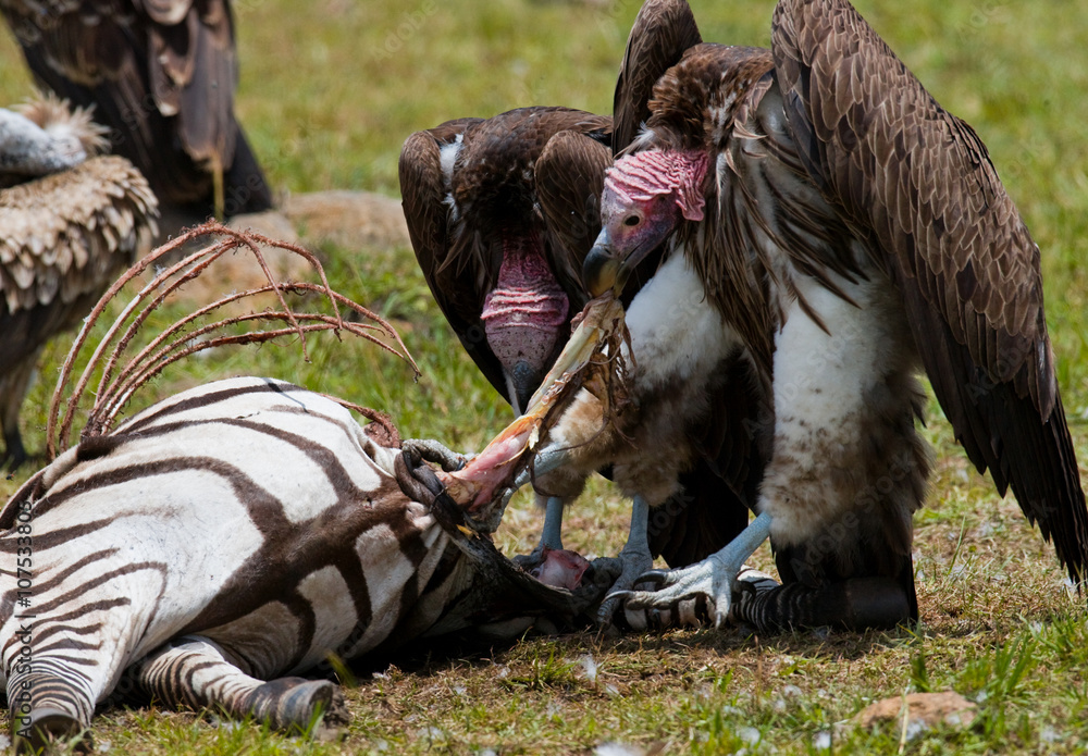 Predatory birds eat the prey in the savannah. Kenya. Tanzania. Safari. East Africa. An excellent illustration.