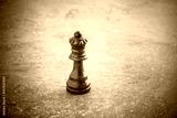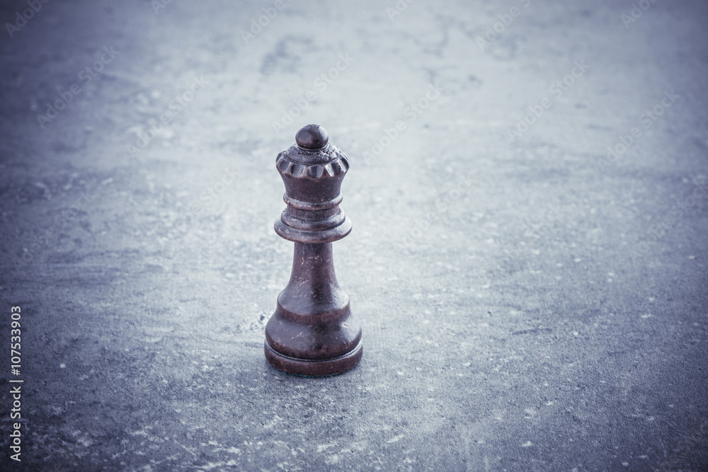 One black chess queen standing alone on stone table with copy space. Concept of strategy, competition and leadership.