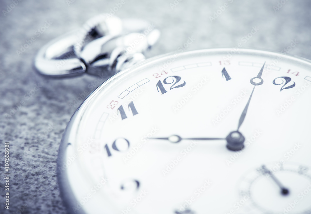 Pocket watch in close up lying on stone table. Vintage timepiece still life. Concept of time, deadline and nostalgia.