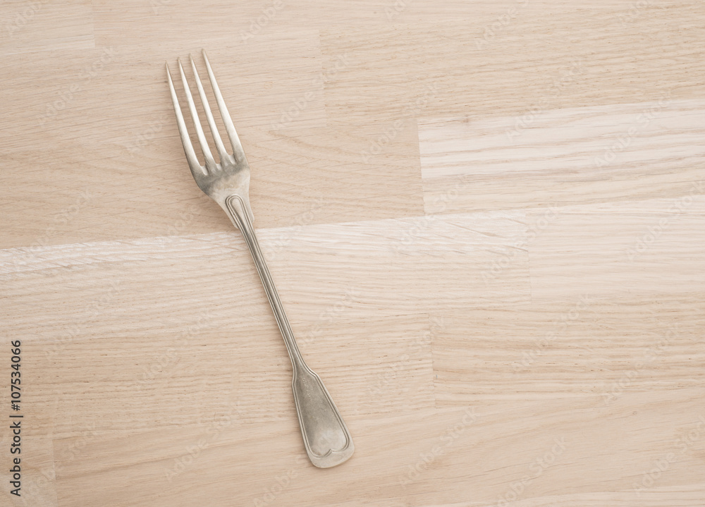 Silver fork lying on wooden table with copy space. Still life of vintage cutlery in kitchen. Concept of eating, cooking or restaurant.