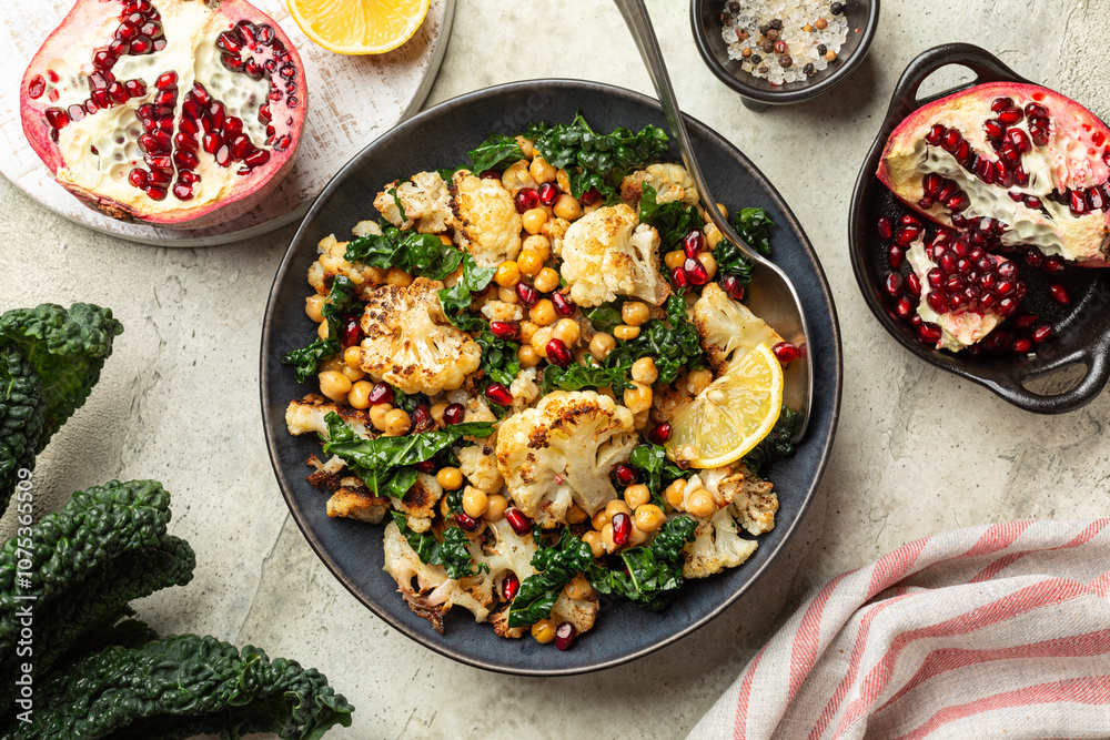 Top view of Roasted Cauliflower and roasted chickpeas salad, with pomegranate, kale, with spices, oil and lemon dressing. Vegetable food on a light background.