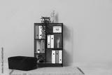 Shelf unit with document folders, plants and pouf near orange wall in office
