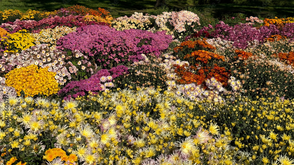 Chrysanthemum flowers mix garden mums colorful blooms flowerbed.