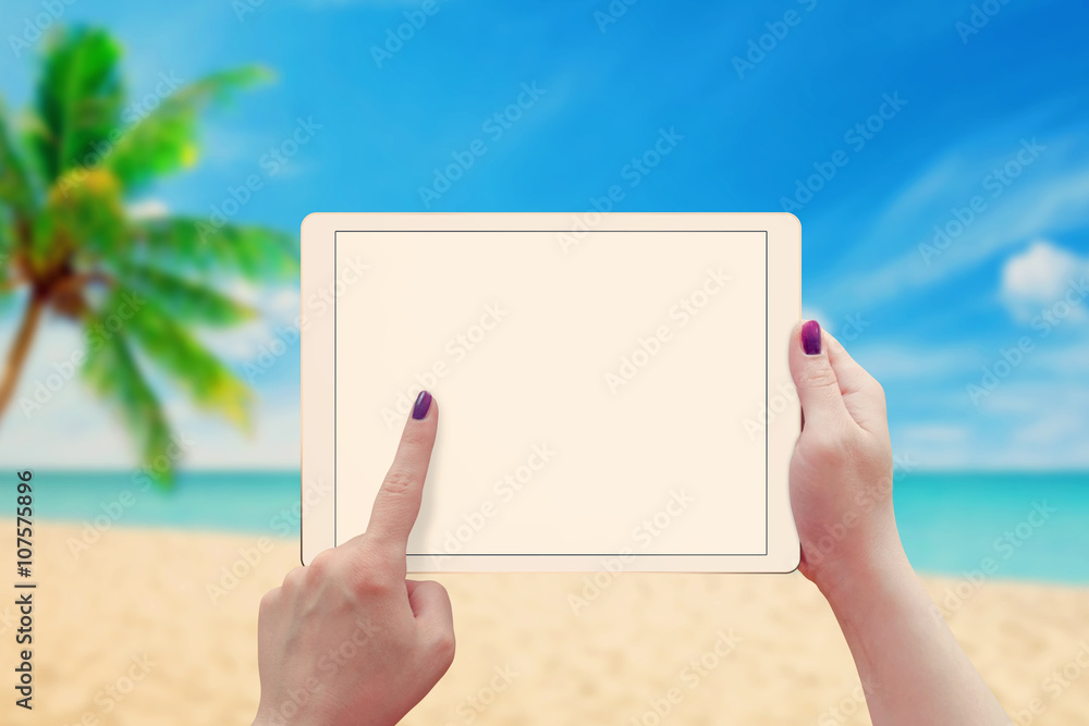 Tablet with white screen in man hands. Isolated tablet, vertical position.